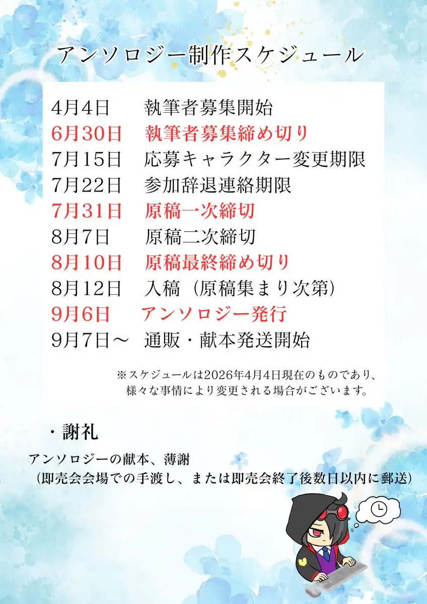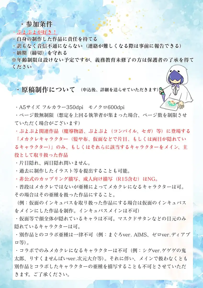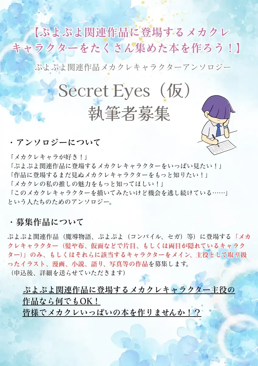 ということで2026年9月6日に開催するぷよ主義にあわせ、ぷよぷよ関連作品に登場するメカクレキャラを集めたアンソロジーを発行します(したいです)!