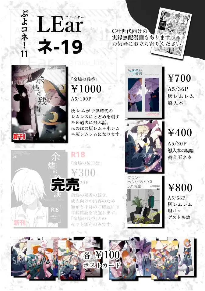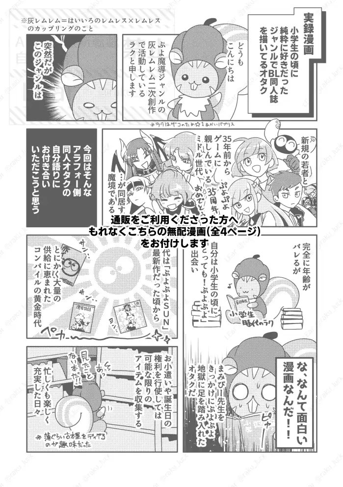 サークル名LEarペンネームラクタグレムレスはいいろのレムレス灰レムレムリンクサークル紹介はいいろのレムレス×レムレスの漫画をメインに描いているサークルです。通販をご利用くださった方へ、C社世代向けの無料配布漫画をもれなくお付けしています。クロスフォリオにて作品公開、通販受付しています。✕close✕close通販リンク自家通販