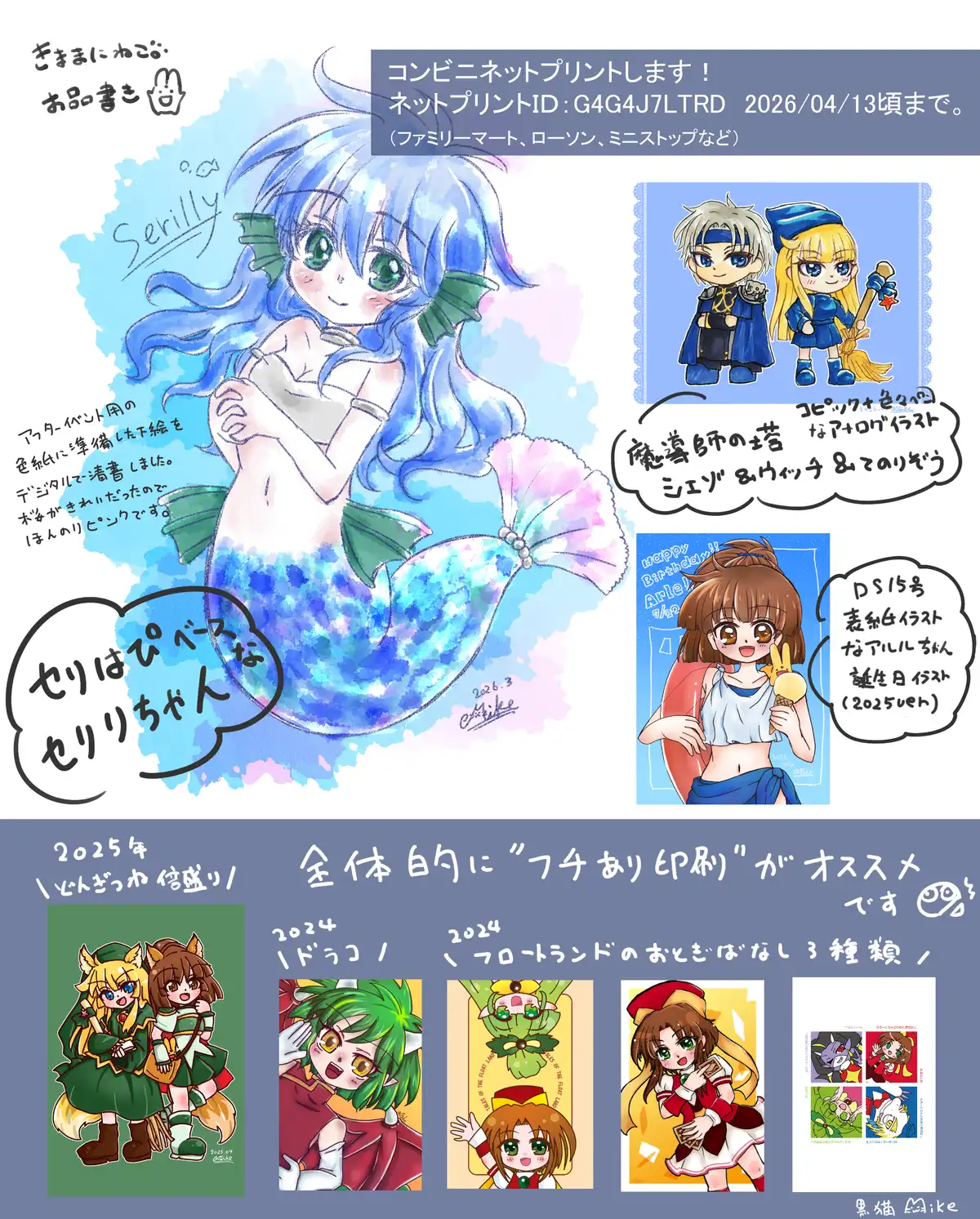 サークル名きままにねこ。ペンネーム黒猫Mikeタグセリリアルルウィッチネットプリントリンクサークル紹介たまにのんびりお絵かきをしています。ネットワークプリント配信中です!コンビニネットプリントID[G4G4J7LTRD]いつか薄い本も出してみたいですね><アフター色紙抽選会も参加します><✕close✕close通販リンクBOOTH